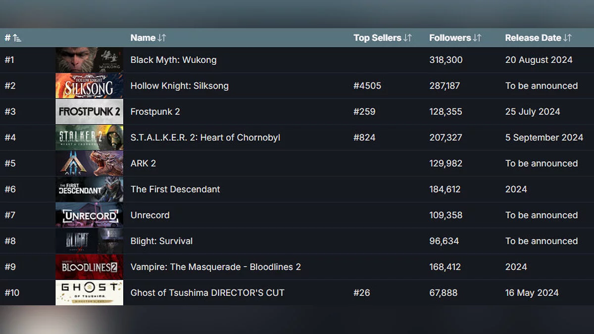 Второе место в топе заняла метроидвания Hollow Knight: Silksong, у которой до сих пор нет даты релиза. На третьей позиции расположилась смесь градостроительной стратегии и симулятора выживания Frostpunk 2 — она выйдет 25 июля. Также в список попали шутер S.T.A.L.K.E.R. 2, выживалка ARK 2, ролевой экшен Vampire: The Masquerade — Bloodlines 2 и ещё несколько игр.