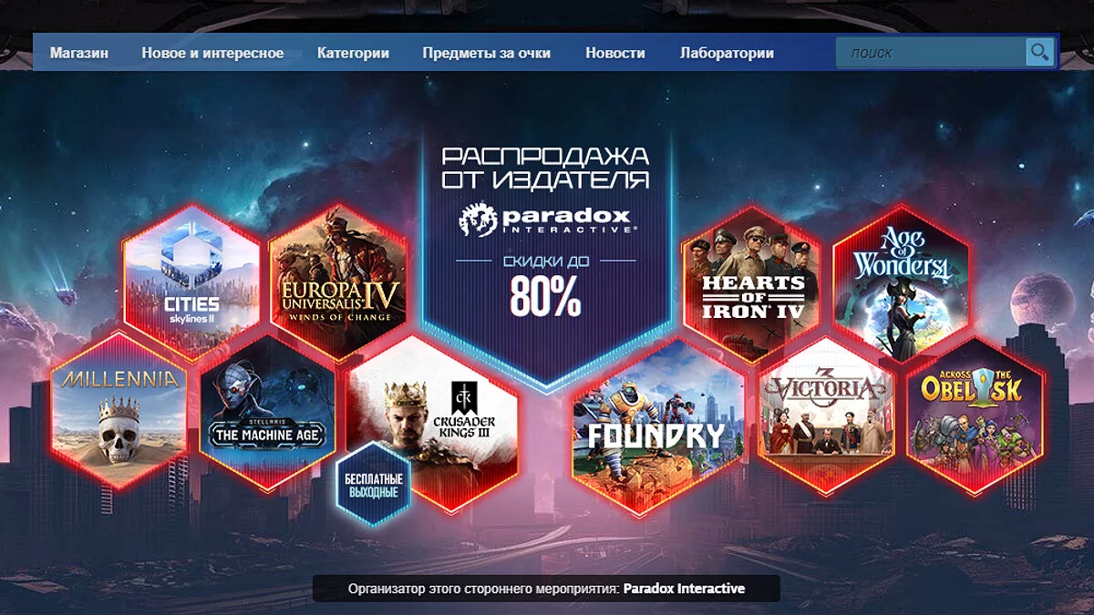 Издатель Paradox Interactive, который не ушёл из России, запустил в Steam распродажу своих игр со скидками до 80%. Акция продлится до 23 мая 20:00 по московскому времени.
