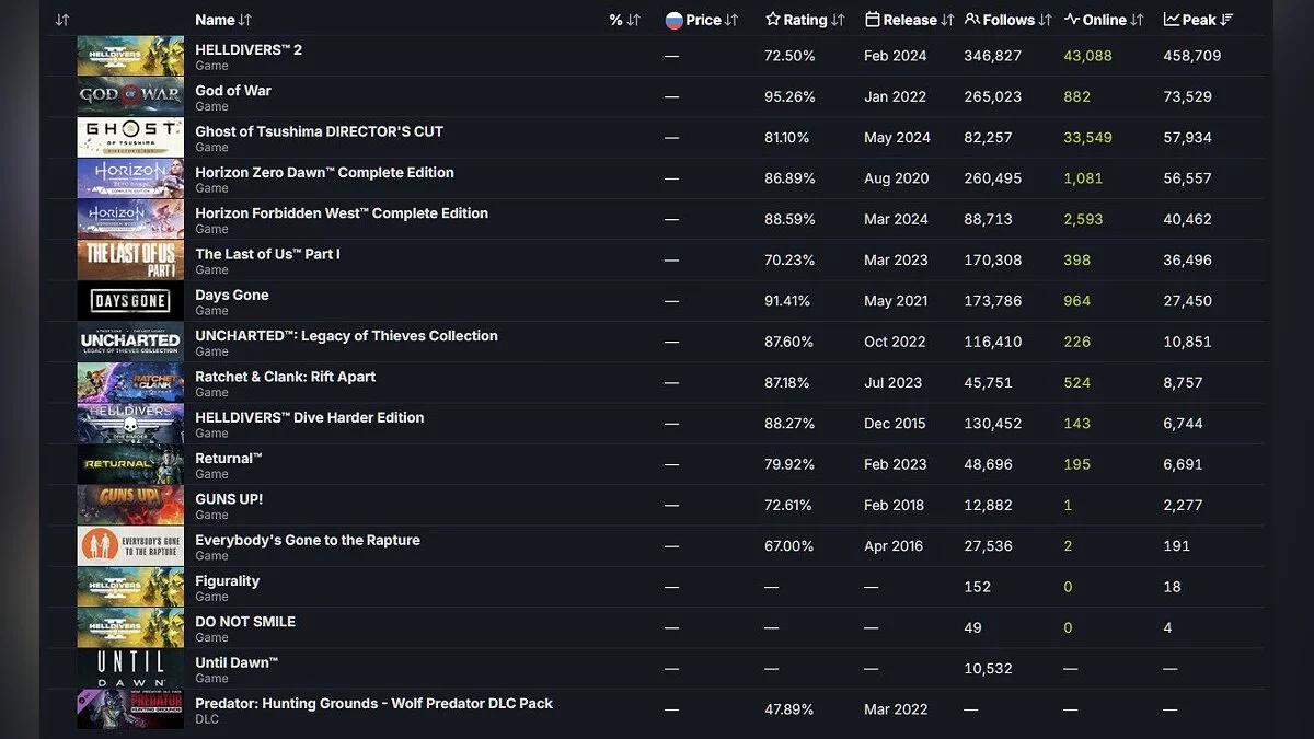 57 тысяч — третий лучший показатель для игр Sony в Steam. На первом месте с огромным отрывом расположилась Helldivers 2 (458 тысяч), а «серебро» по-прежнему у God of War (73 тысячи).