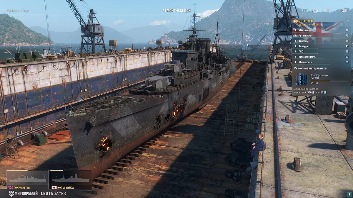 - Ремонтный док: новая механика, позволяющая собирать премиумные и особые корабли при помощи ремонтных материалов. В патче 13.4 можно начать ремонтировать крейсер Exeter и линкор Hyuga;
