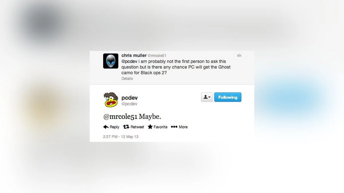 Данное сообщение вызвало волну интереса среди пользователей, один из которых поинтересовался, планируют ли разработчики в будущем добавить оружейный камуфляж «призраков» в Call of Duty: Black Ops 2, и ответом ему было многозначительное «Возможно».