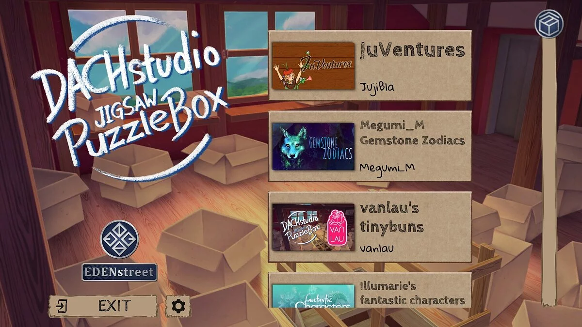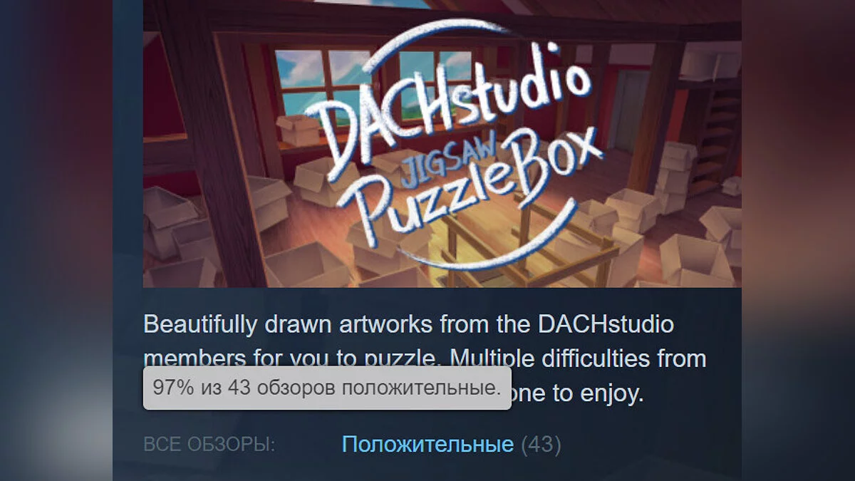 DACHstudio Jigsaw Puzzle Box — расслабляющая игра, где нужно собирать мозаику. Есть сложные изображения, состоящие из 728 фрагментов. Имеет 97% рейтинга. Страница в Steam.