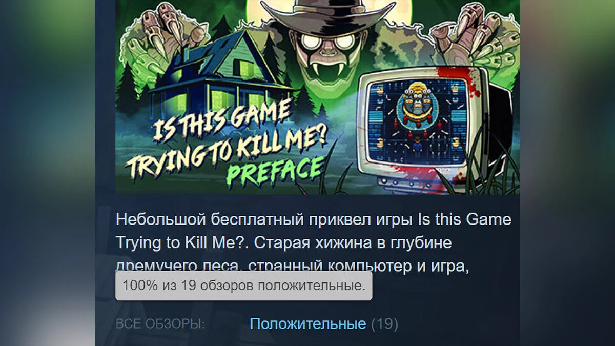 Is this Game Trying to Kill Me? Preface — смесь хоррора и головоломки с видом от первого лица, где главный герой оказался запертым внутри хижины в глубине леса, хозяин которой предлагает сыграть в игру в обмен на свободу. Имеет 100% положительных отзывов. Страница в Steam.
