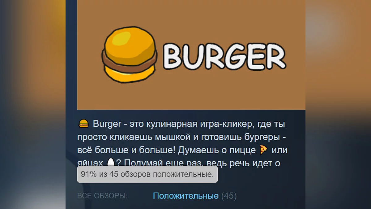 Burger — простенькая кулинарная игра-кликер с примитивный графикой, где нужно нажимать только на кнопку и готовить сочные бургеры. Получила 91% рейтинга. Страница в Steam.