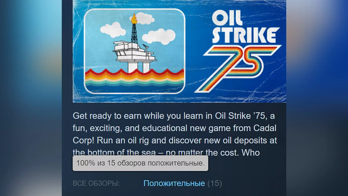 Oil Strike '75 — игра про управление буровой установкой и поиски залежей нефти на дне моря с графикой в духе 8-битных проектов. Имеет 100% положительных отзывов. Страница в Steam.