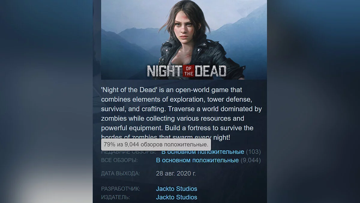Night of the Dead представляет собой кооперативную выживалку с видом от первого лица, где в одиночку или вместе с друзьями нужно исследовать постапокалиптический мир с разнообразными биомами, множеством видов зомби и подземельями, собирать ресурсы, строить базу и крафтить необходимые для выживания предметы. Проект получил 9 тысяч отзывов и 79% рейтинга.