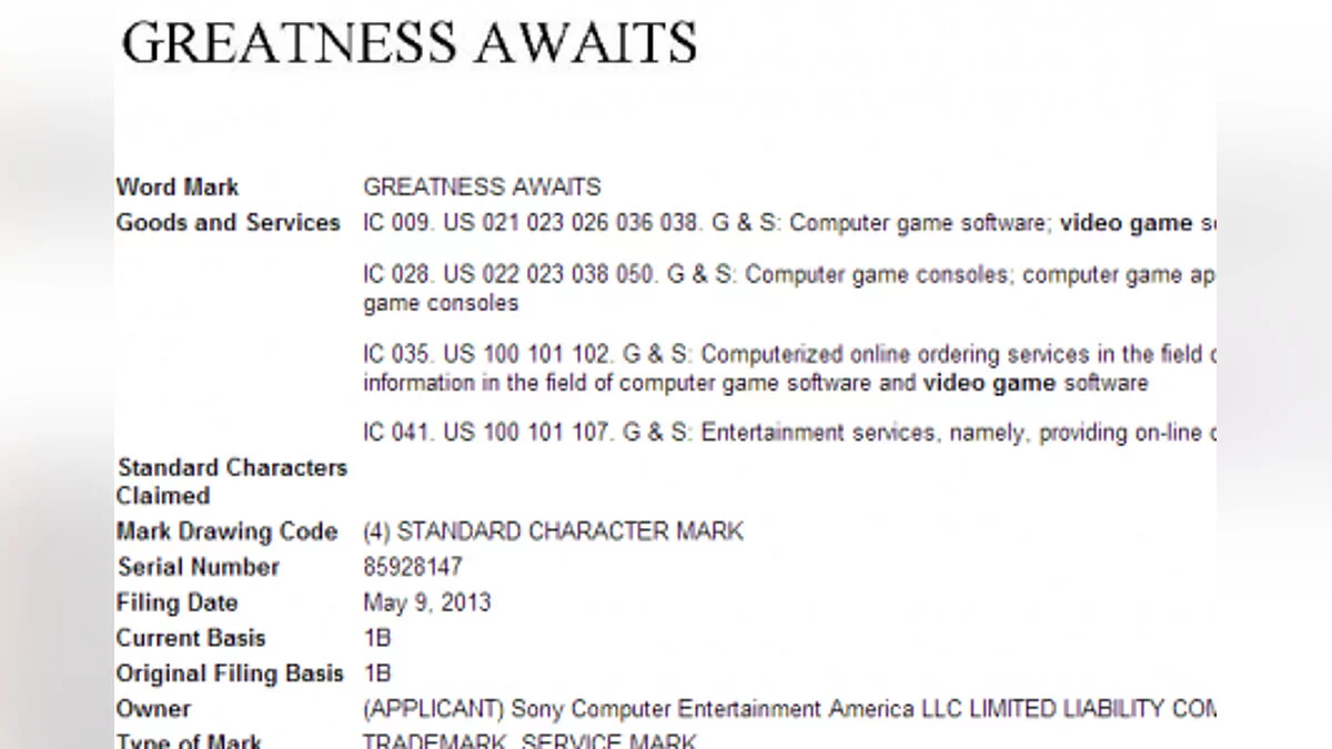 Ресурс Siliconera доложил, что американский филиал Sony Computer Entertainment зарегистрировал торговую марку «Greatness Awaits» («Великие дела ждут»). Данный слоган имеет отношение к рекламному материалу новой консоли, ранее найденному в сети: