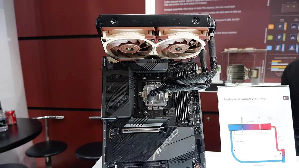 На выставке Computex 2024 компания Noctua представила прототип революционной системы жидкостного охлаждения, лишённой традиционного насоса. Этот уникальный подход основан на использовании двухфазного термосифона, который обеспечивает циркуляцию охлаждающей жидкости без механических движущихся частей.