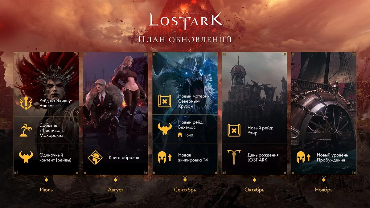 В летние месяцы с июля по август в игре появятся эпилог рейда на Экидну, событие «Фестиваль Махараки», новый одиночный контент (рейды), а также книга образов. С сентября по ноябрь разработчики добавят материк Северный Крузан, рейды Бехемос и Эгир, экипировку Т4 и новый уровень Пробуждения. В октябре также пройдет день рождения Lost Ark.