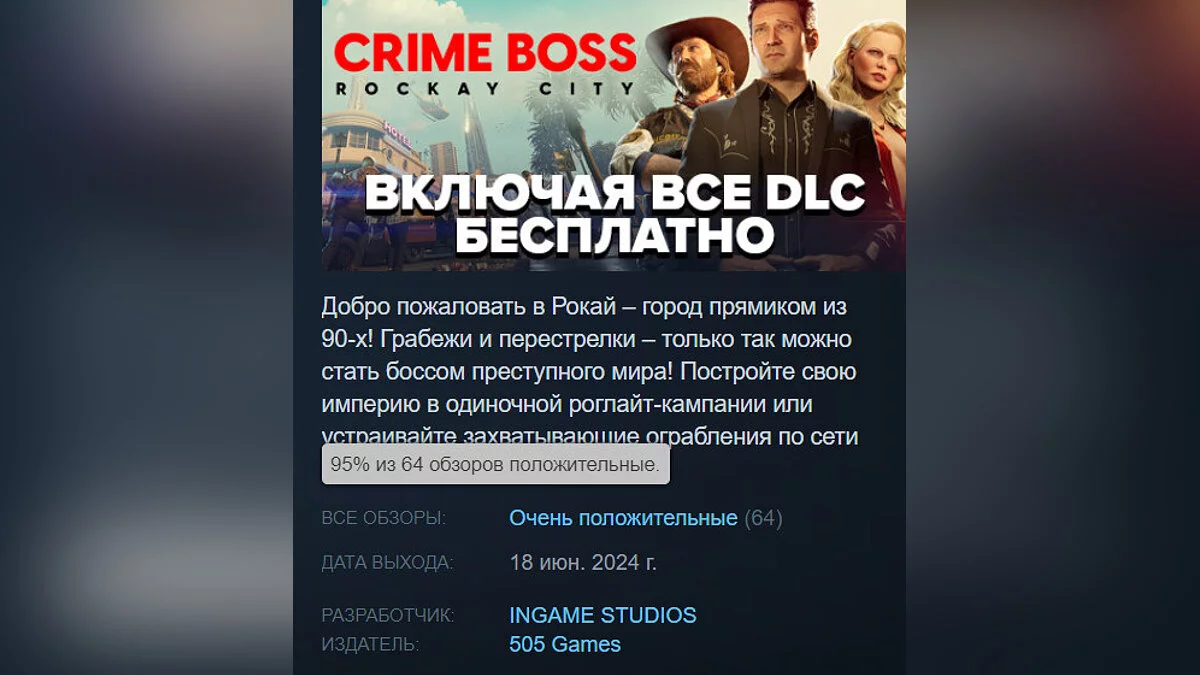 Кооперативный шутер Crime Boss: Rockay City, который ранее был эксклюзивом EGS, добрался до Steam. Игру можно купить в России — до 11 июля её отдают со скидкой 20% за 815 рублей.