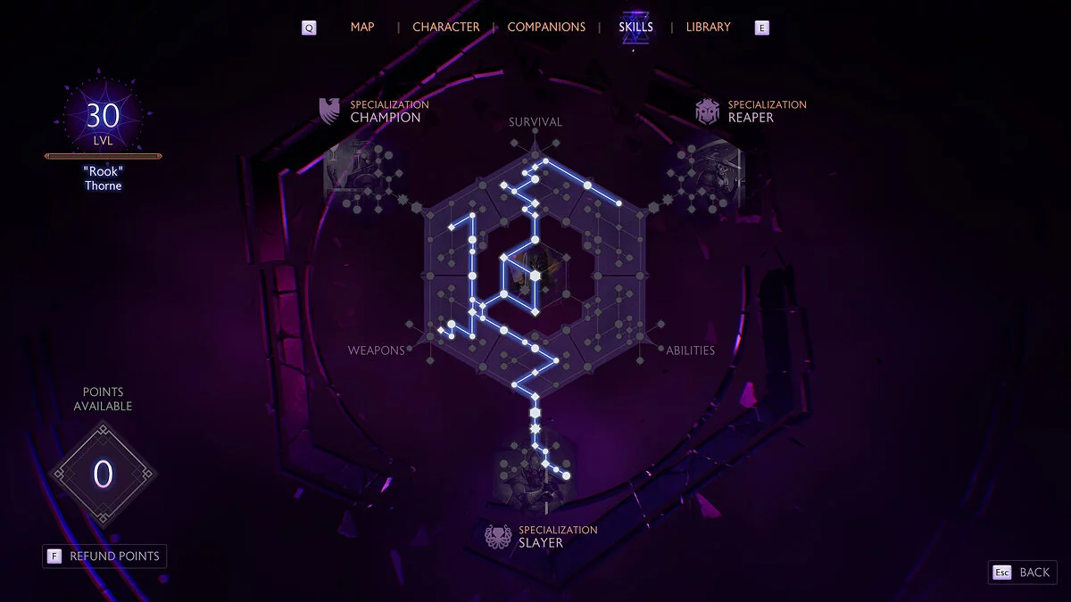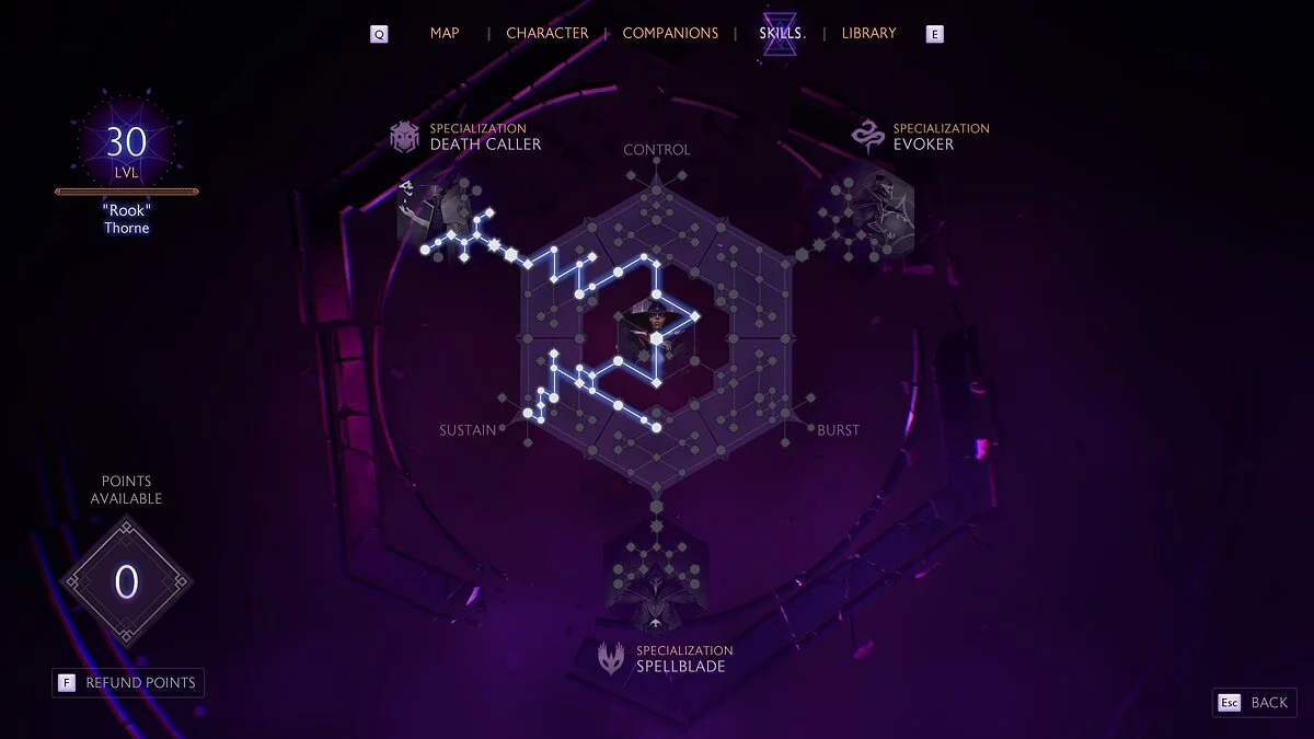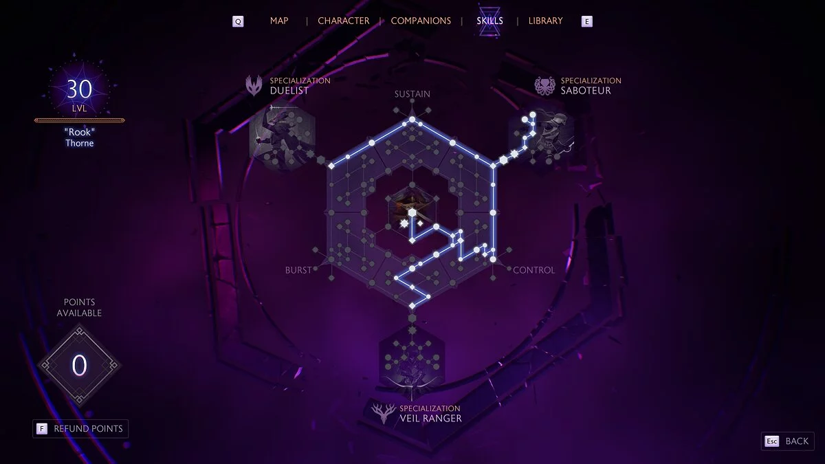 - Древо навыков представляет собой шестиугольник с множеством способностей и талантов. На внешних сторонах находятся специализации;