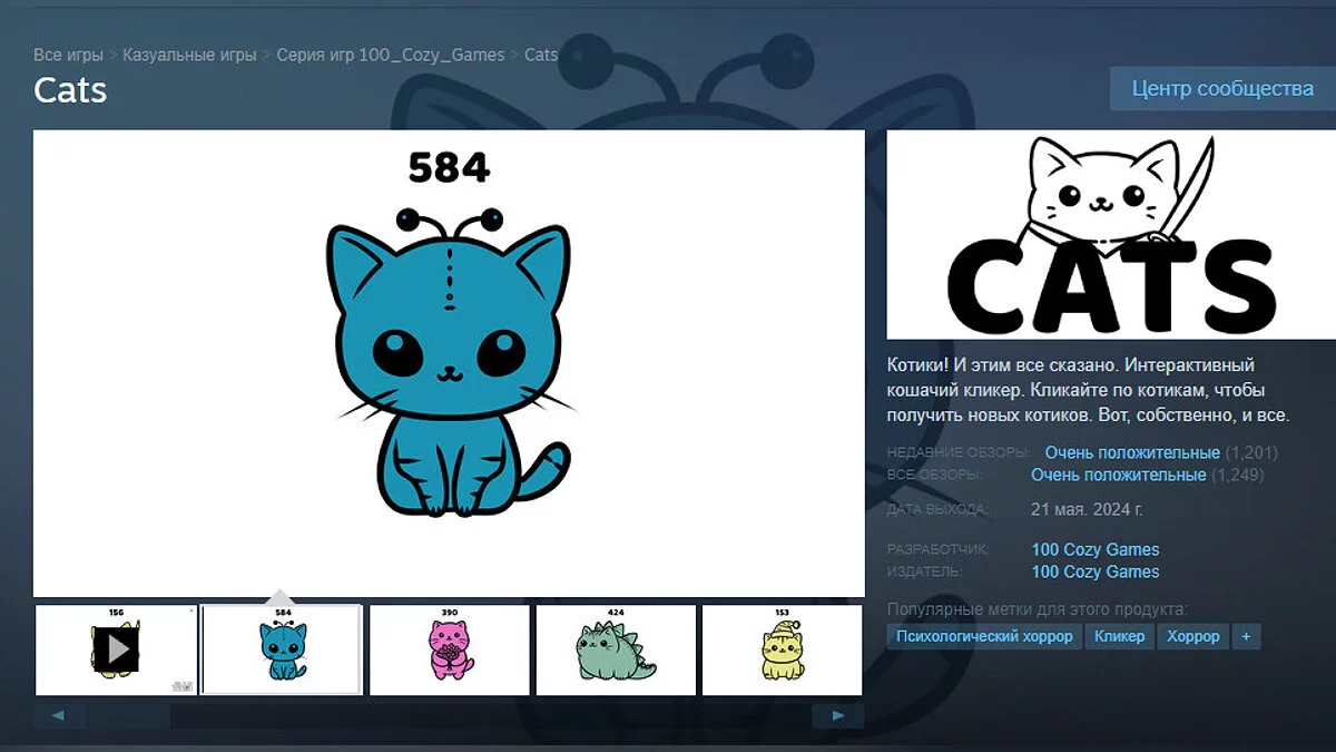 - Cats — кликер, где нужно кликать по котам (83% рейтинга);