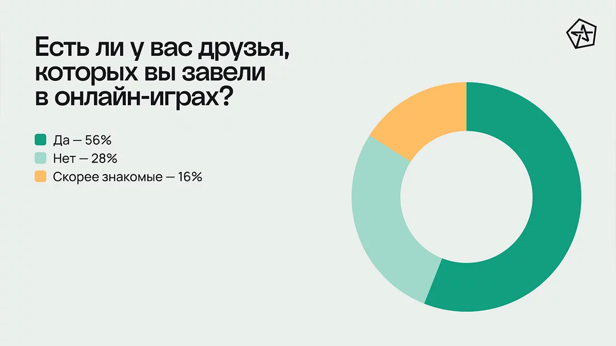 Согласно исследованию, около 60% геймеров нашли друзей в онлайн-игре, причем у трети опрошенных дружба перешла в оффлайн. 9 из 10 игроков заявили, что их увлечение никогда не становилось причиной для разрыва дружеских или романтических отношений.