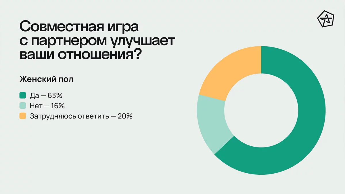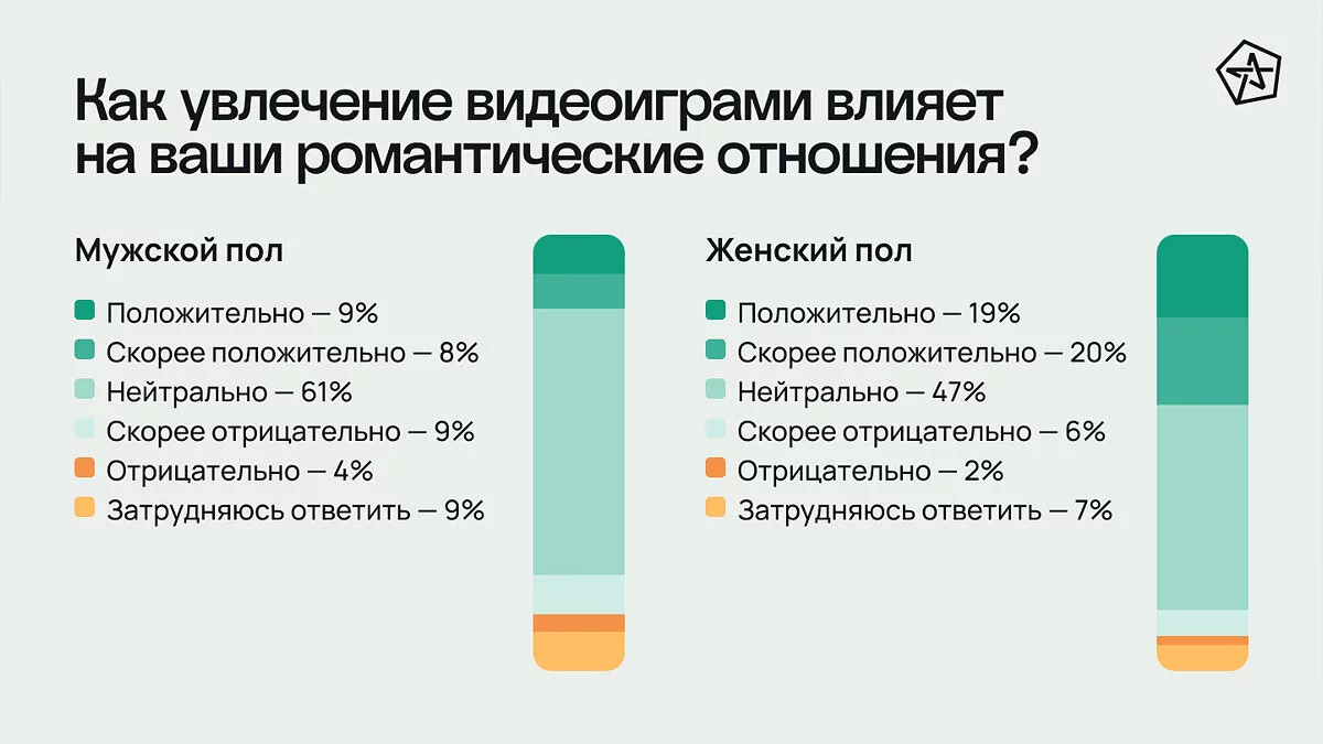 Около 70% опрошенных женщин считают нормальным, что мужчины увлекаются видеоиграми. Более того, 81% женщин-геймеров отметили, что хобби только укрепляет отношения, хотя среди мужчин так думает только 47% опрошенных.