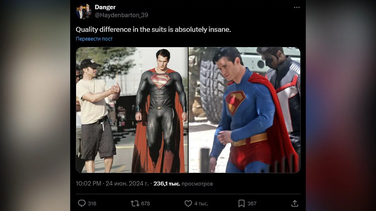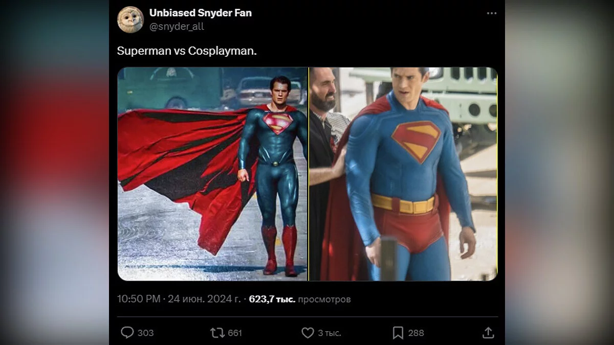«Я искренне шокирован. Я ожидал, что Ганн уйдет в ностальгию и покажет классического Супермена в костюме, напоминающем кинематографическую эстетику Снайдера, но вместо этого он выбрал этот странный, дешево выглядящий косплей, созданный в стиле MCU, монстр Франкенштейна»