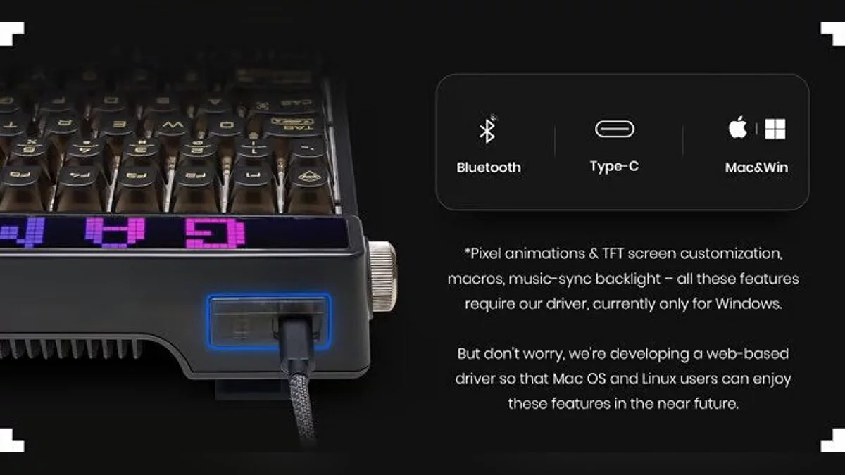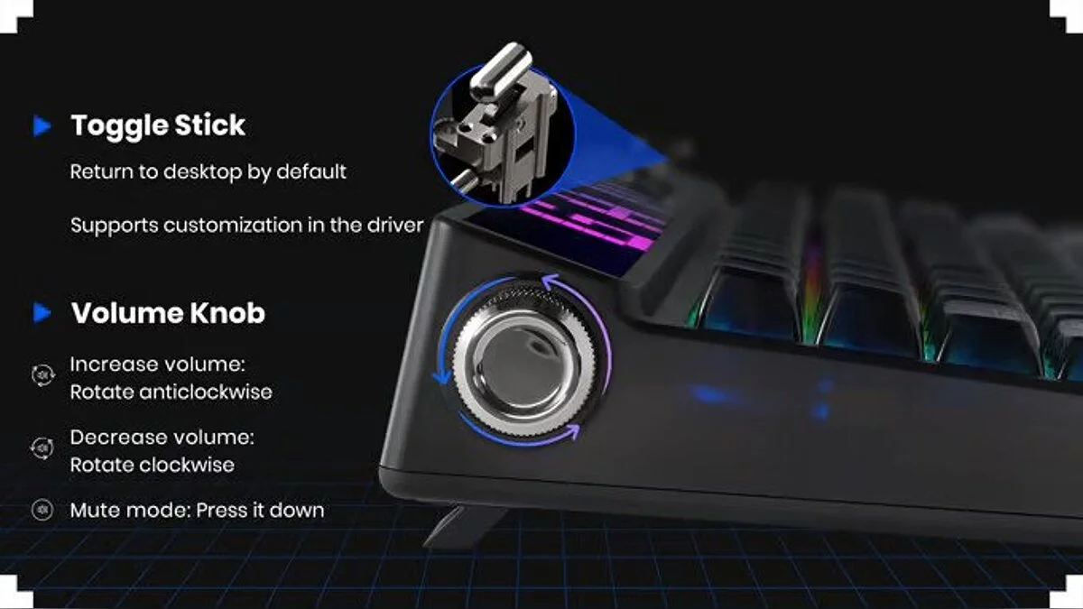 В верхней части расположено два дисплея 6,9-дюймовый способен отображать текст, анимации или работать в режиме подсветки, синхронизируясь с кнопками, а дисплей — 1,47-дюймов, отображающий время, погоду, настройки клавиатуры и системные параметры. Всего поддерживается 20 режимов свечения, а также синхронизация с музыкой.
