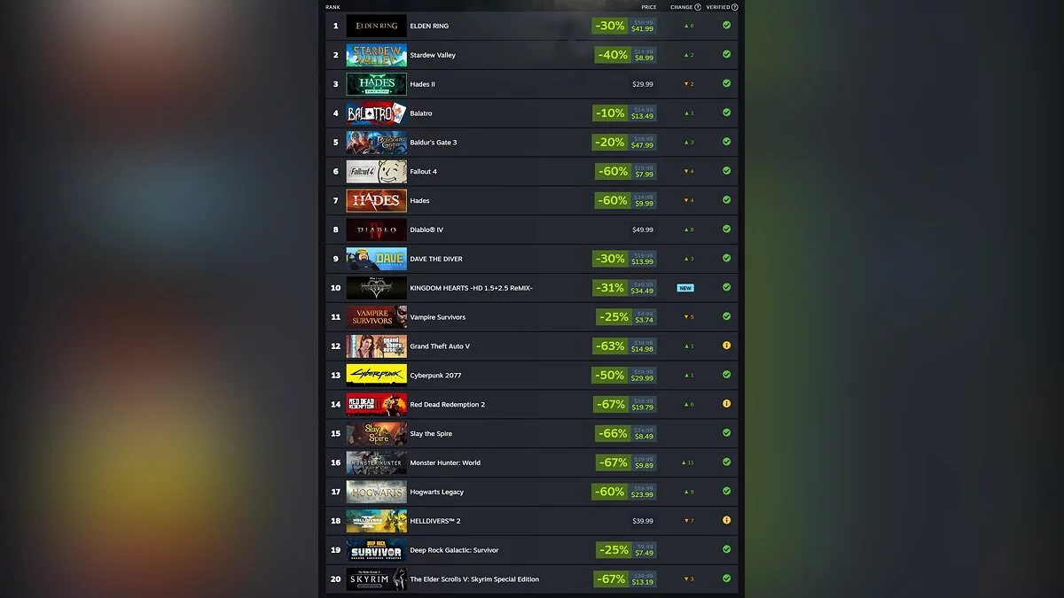 Из игр 2024 года в топ попали только четыре проекта — карточный рогалик Balatro, экшен-рогалик Hades 2, шутер Helldivers 2 и сборник KINGDOM HEARTS -HD 1.5+2.5 ReMIX-. Самыми старыми играми в списке оказались The Elder Scrolls 5: Skyrim Special Edition, GTA 5, Fallout 4 и Stardew Valley.