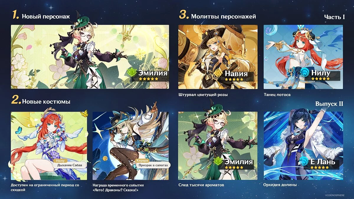 В трейлере обновления продемонстрировали новую временную локацию, которая будет доступна только в версии 4.8, одного нового играбельного персонажа — дендро-копейщицу Эмилию, скины для Нилу и Кирары, а также несколько ивентов. Что касается тизера Натлана, то в нём можно увидеть трёх персонажей, которые, судя по всему, станут играбельными после выхода обновления 5.0.
