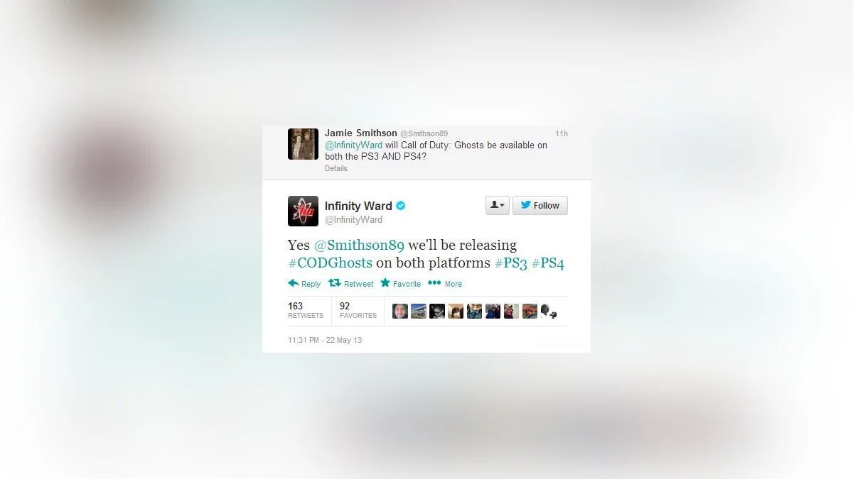 Infinity Ward через свой Twitter официально подтвердила, что Call of Duty: Ghosts выйдет не только на PlayStation 3, но и на PlayStation 4.
