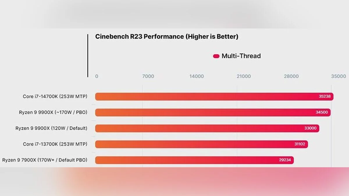 Процессор Ryzen 9 9900X оснащен 12 ядрами архитектуры Zen 5, в то время как его основные конкуренты, такие как Intel i7-147000 и Core i9-14900K, имеют соответственно 20 и 24 ядра. В тесте Cinebench R23 Ryzen 9 9900X набирает 33 000 баллов при стандартных настройках и 34 500 баллов в режиме Precision Boost Overdrive (PBO), что выше предшествующей модели 14% и 18% соответственно и немногим меньше чем Intel i7-147000. Примечательно, что при этом новый процессор имеет более низкий показатель тепловыделения (TDP), сохраняя одинаковое количество ядер и максимальную частоту в 5,6 ГГц, в чем превосходит своего конкурента в стане Intel.