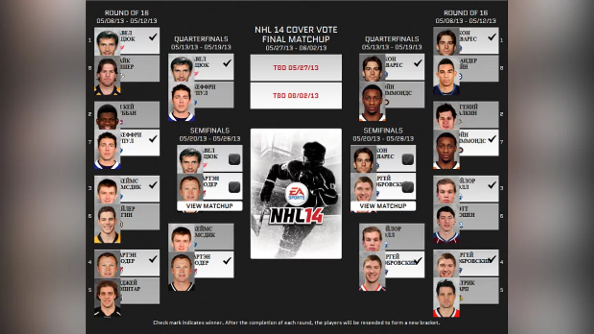 Компания Electronic Arts, совместно с национальной хоккейной лигой США проводит голосование и предлагает всем желающим выбрать человека, чье лицо окажется на обложке NHL 14. Двое россиян — хоккеисты Павел Дацюк и Сергей Бобровский — пробились в полуфинал голосования.