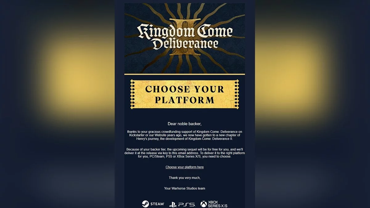 Если давным-давно вы участвовали в Kickstarter-кампании Kingdom Come: Deliverance, то советуем проверить почту. Студия Warhorse начала раздавать Deliverance 2 тем игрокам, которые когда-то профинансировали разработку первой главы.