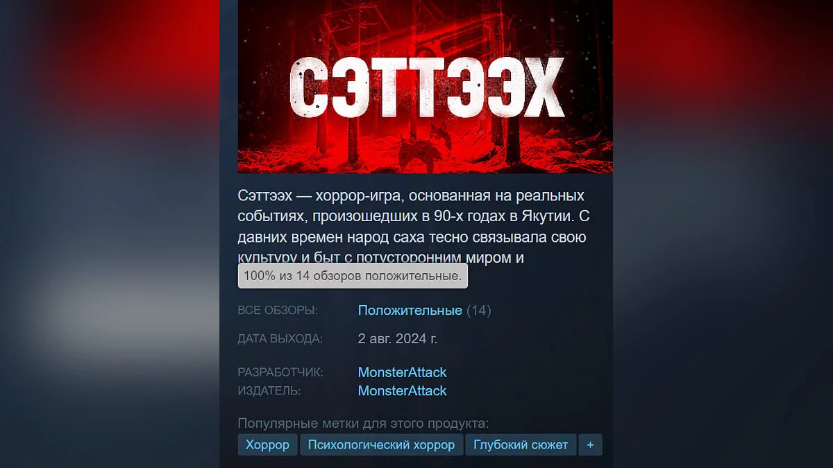 В сервисе Steam состоялся релиз хоррора «Сэттээх», разработанного российским разработчиком Николаем Тарковским. До 16 августа игра продаётся со скидкой 10% за 238 рублей.