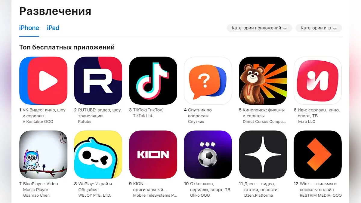 ТОП-10 приложений в категории «Развлечения»: