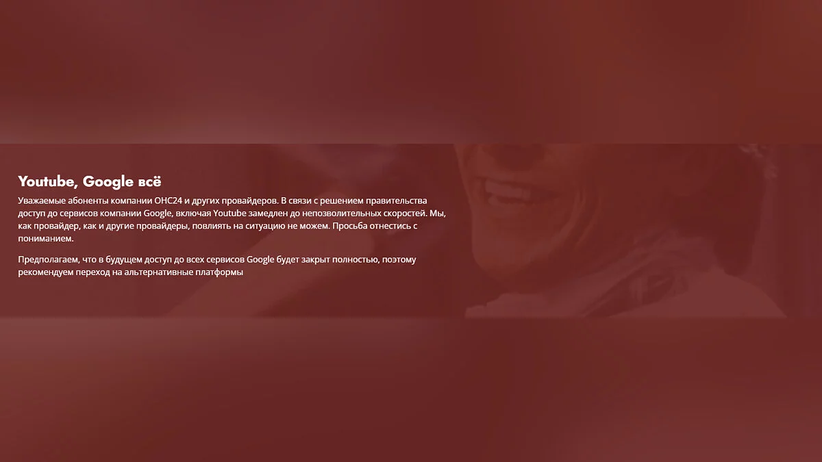Уважаемые абоненты компании ОНС24 и абоненты других провайдеров. В связи с решением правительства доступ до сервисов компании Google, включая видеохостинг Youtube замедлен до непозволительных скоростей. Мы, как провайдер, как и другие провайдеры, повлиять на ситуацию не можем. Просьба отнестись с пониманием.