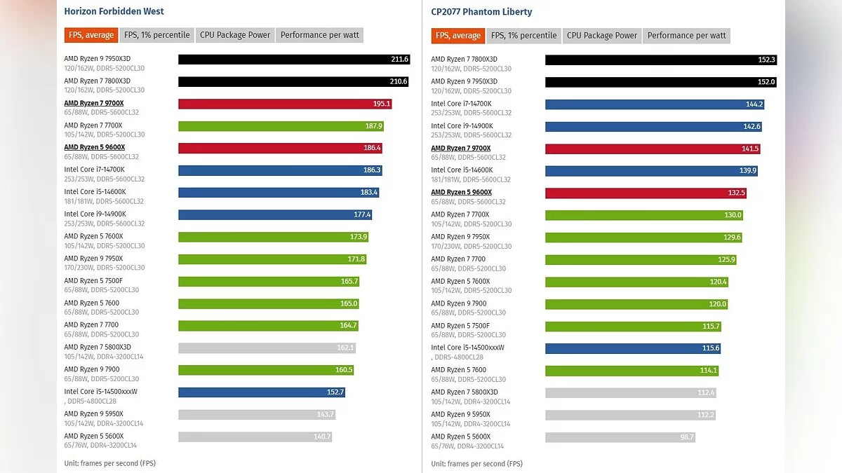 По данным ComputerBase и Tom's Hardware, в играх Ryzen 7 9700X лишь на 4 % быстрее младшей модели, при этоми обе новинки показывают преимущество в 2–3 % над предшественниками Ryzen 5 7600X и Ryzen 7 7700X. Обозреватели отмечают высокую энергоэффективность новых процессоров AMD. При энергопотреблении 65 Вт в стандартном режиме и 88 Вт при максимальной нагрузке, они значительно превосходят Intel Core i5 и i7, потребляющие 125 Вт и выше.