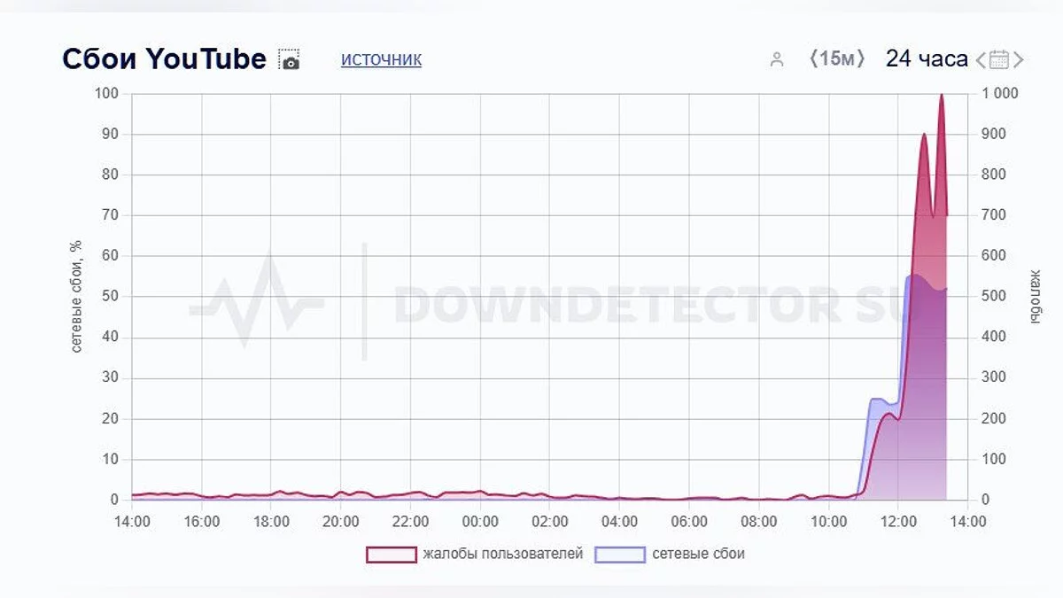 Согласно специализированным сайтам, отслеживающим сбои в работе сервисов, проблемы с YouTube начались примерно в 11:00 МСК. Связано ли это с замедлением, неизвестно.