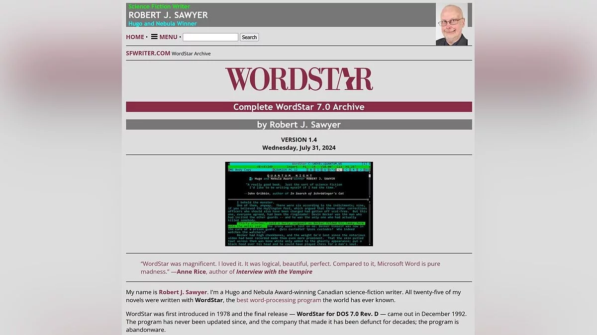 Писатель-фантаст, лауреат премий «Хьюго» и «Небьюла» Роберт Дж. Сойер (Robert J. Sawyer) выпустил пересобранную версию текстового редактора WordStar 7.0 для современных ПК на Windows. Этой программой в свое время пользовались такие авторы, как Джордж Р. Р. Мартин (George R.R. Martin) и Артур К. Кларк (Arthur C. Clarke).
