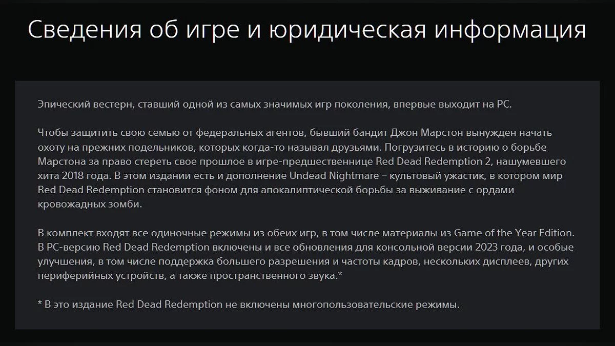 Согласно описанию, главными особенностями порта станут повышенные разрешение и фреймрейт, поддержка нескольких дисплеев и пространственного звука. В остальном это то же переиздание 2023 года — без мультиплеера, но с DLC Undead Nightmare и русскими субтитрами.