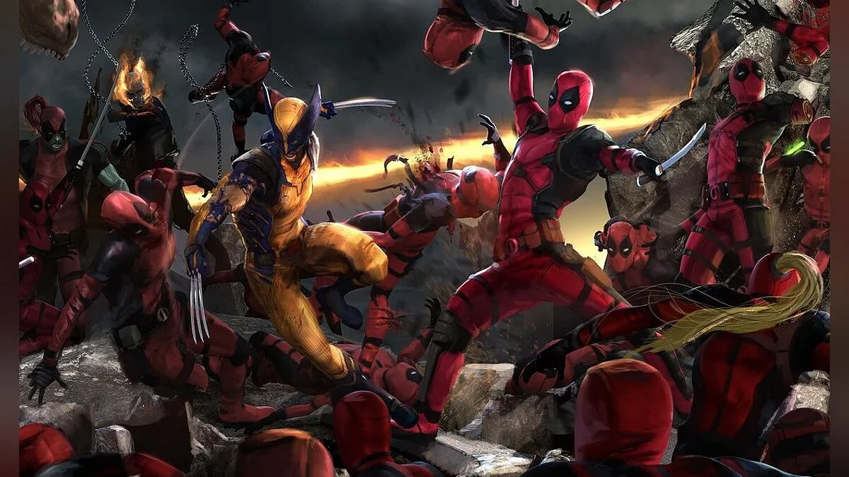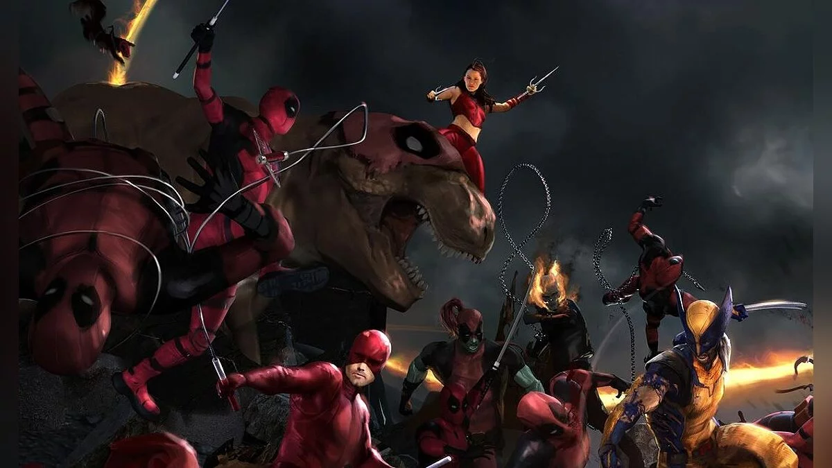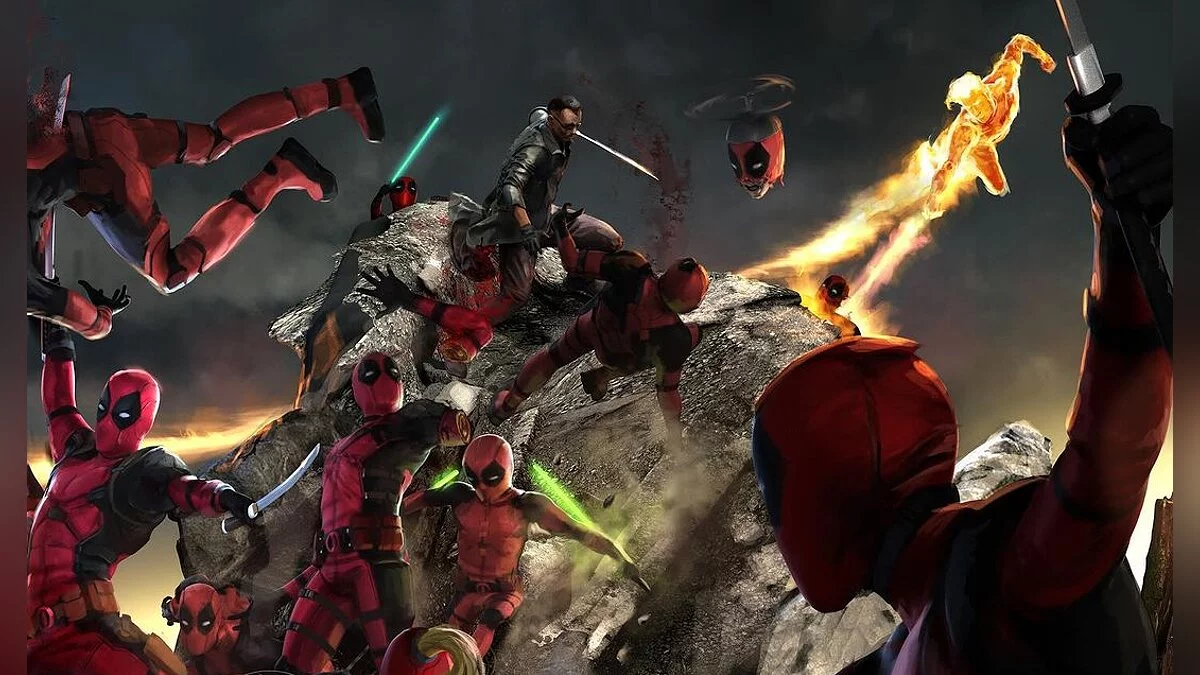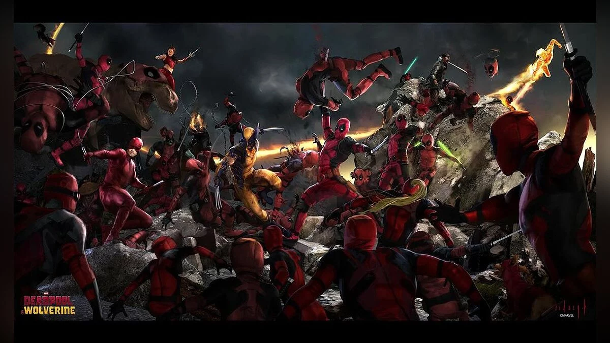 На иллюстрации представлена масштабная битва с участием главных героев и Корпуса Дэдпулов. В ранней версии сцены можно увидеть несколько новых лиц (и морд): Динозавра Дэдпула, Призрачного гонщика и Сорвиголову. На арте также засветились Блейд, Джонни Шторм и Электра, которые есть в фильме, но конкретно в этой битве они не участвовали.