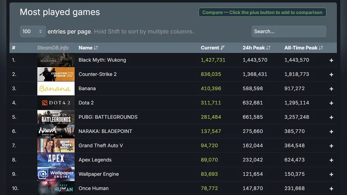 По данным SteamDB, точный онлайн равняется 1 443 570 игрокам. На момент написания заметки это самый популярный тайтл по текущему онлайну в Steam, обогнавший Counter-Strike 2, Banana и Dota 2.