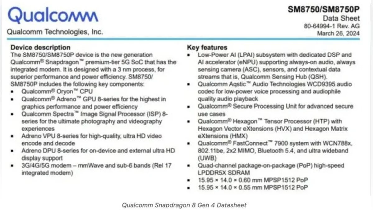 В преддверии официального анонса нового чипсета от Qualcomm, инсайдеры раскрыли характеристики грядущего флагмана. По утекшей информации, мобильный процессор будет представлен в двух вариантах. Согласно данным, 3-нанометровый Snapdragon 8 Gen 4 (SM8750) будет оснащен двумя мощными ядрами Oryon с тактовой частотой 4 ГГц, которые использовались в процессорах для ноутбуков Snapdragon X. Остальные шесть ядер будут работать на частоте 2,8 ГГц. Специальная версия этого чипа для смартфонов Galaxy получит ещё более высокую частоту, однако точные параметры пока не разглашаются.