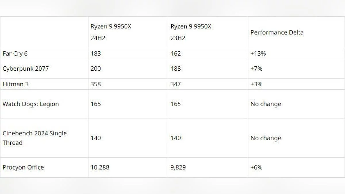 Наиболее важным фактором расхождений, по мнению AMD, стало отсутствие в тестируемых версиях Windows 11 23H2 улучшенного модуля предсказания переходов, который присутствует в версии 24H2. AMD предоставила данные, показывающие, что переход на Windows 11 24H2 может улучшить производительность игр до 13%, что является значительным увеличением по сравнению с текущими результатами. В связи с этим, AMD уверяет, что после выхода обновления Windows 11 24H2 процессоры Ryzen 9000 продемонстрируют рост производительности на 10% в обычных рабочих нагрузках, до 25% в задачах, связанных с искусственным интеллектом и на 5–8% в играх.