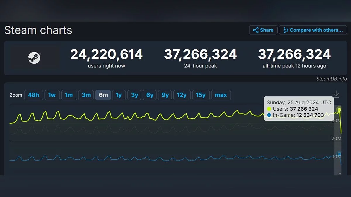В Steam обновился рекорд по количеству пользователей в онлайне. В сервисе одновременно находились 37,2 млн геймеров. Это произошло в выходные, а именно 25 августа.