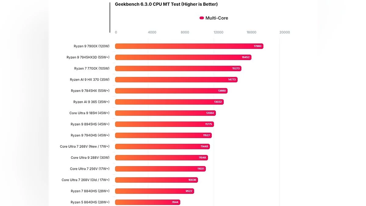В базе данных Geekbench был замечен новый, ещё не представленный процессор Intel Core Ultra 7 268V, предназначенный для ноутбуков. Одной из главных особенностей новинки является её низкое энергопотребление — заявленный TDP всего 17 Вт. Несмотря на это, процессор показывает внушительные результаты в тестах производительности. В многопоточных тестах Geekbench он набрал 11 448 баллов, что выше показателя 28-ваттного Ryzen 7 8840HS и сравнимо с результатами 45-ваттных моделей Ryzen 9 7940HS и Core Ultra 9 185H.