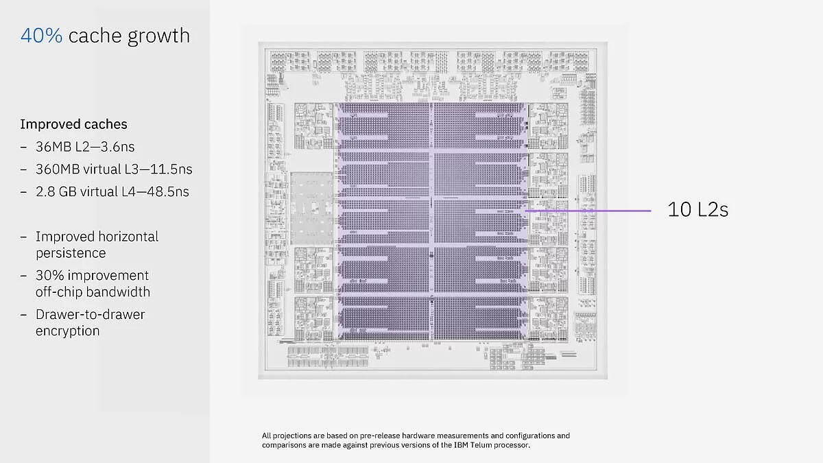 Telum II, разработанный с использованием 5-нанометровой технологии Samsung, включает восемь высокопроизводительных ядер, работающих на частоте 5,5 ГГц. Важным улучшением стало увеличение кеш-памяти L3 до 360 Мбайт, а L4 до 2,88 Гбайт. Новая архитектура поддерживает тип данных INT8, что обеспечивает более высокую эффективность вычислений. Тelum II предлагает четырехкратное увеличение вычислительной мощности, достигая 24 триллиона операций в секунду и позволяет более эффективно распределять нагрузку между процессорными ядрами и ИИ-ускорителями.