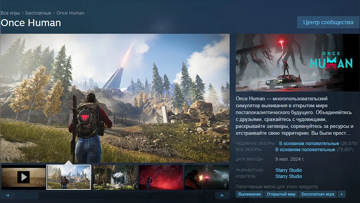 - Once Human — постапокалиптическая MMO-выживалка с открытым миром. Игру не перевели на русский язык, но выпустили в России. Имеет 79 тысяч отзывов и 72% рейтинга. Страница в Steam.