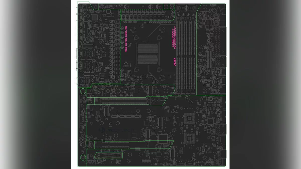 MEG X870E GODLIKE позиционируется как одна из самых мощных и высокотехнологичных материнских плат на рынке, ориентированная на энтузиастов с высокими требованиями и соответствующим бюджетом. Плата оснащена 28-фазной подсистемой питания VRM, каждая фаза которой поддерживает ток в 110 А, что гарантирует совместимость со всеми процессорами платформы AM5 и предоставляет значительный запас прочности для разгона. Два 8-контактных разъёма EPS обеспечивают стабильное питание процессора, а дополнительный 8-контактный PEG-коннектор может использоваться для будущих видеокарт GeForce RTX 50-й серии.