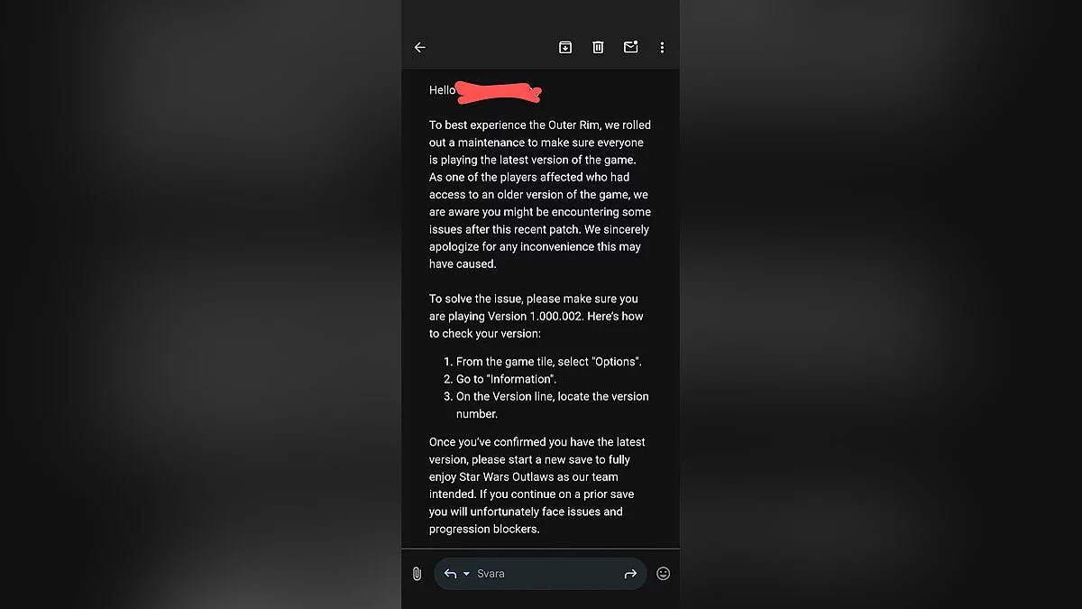 У владельцев Star Wars Outlaws для PlayStation 5 возникли проблемы: Ubisoft попросила их начать игру заново. Разработчики выпустили патч (1.000.002) и отправили игрокам электронные письма с рекомендацией обновить версию.