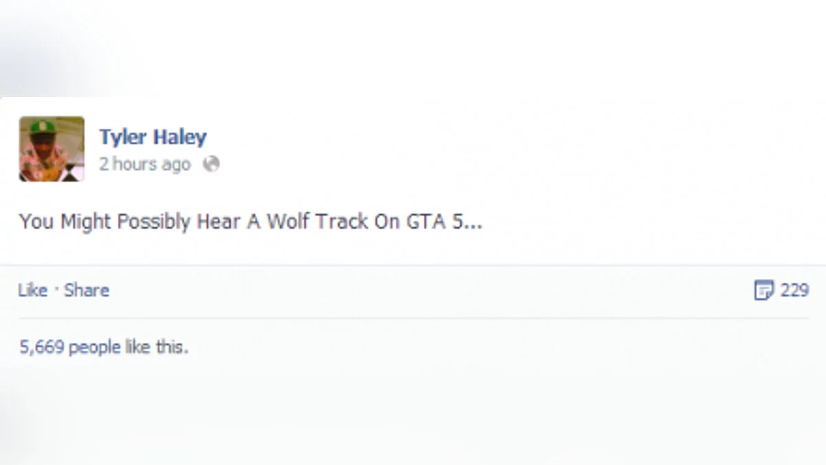 Популярный рэп-исполнитель и продюсер Tyler The Creator намекнул на своей страничке (признано в России экстремистской организацией) в Facebook, где он известен под именем Тайлер Хейли (Tyler Haley), что есть вероятность услышать его трек «Wolf» из одноимённого альбома в Grand Theft Auto 5.