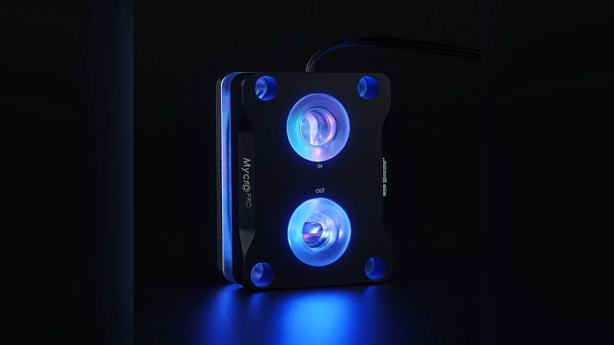 Основная идея разработки Intel Mycro Direct-Die RGB Pro V1 заключается в минимизации звеньев в цепи теплопередачи. При использовании данного водоблока крышка теплораспределителя процессора снимается и водоблок напрямую прижимается к кристаллу процессора через слой термопасты. Новая модель водоблока совместима с процессорами Intel Core 12-го, 13-го и 14-го поколений. Подошва водоблока выполнена из меди с никелевым покрытием, а другие элементы — из акрила и алюминия. Особенностью модели является наличие регулируемой RGB-подсветки, которая подключается к 3-контактному разъему на материнской плате. Водоблок поддерживает фитинги типоразмера G1/4, что делает его совместимым с большинством систем жидкостного охлаждения.