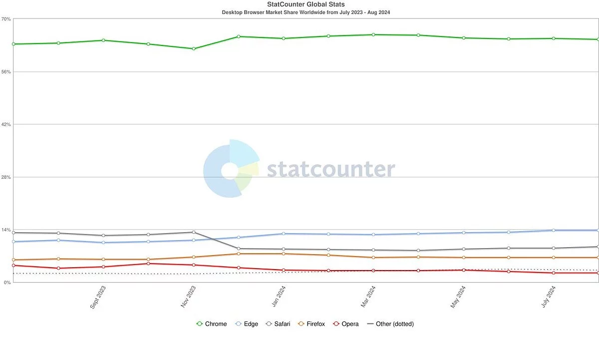 В августе аудитория Google Chrome составила 64,54%. Следующие три места делят Microsoft Edge (13,78%), Apple Safari (9,4%) и Mozilla Firefox (6,65%), чья доля, наоборот, увеличилась. Пятерку замыкает Opera, просевшая на 0,48%.