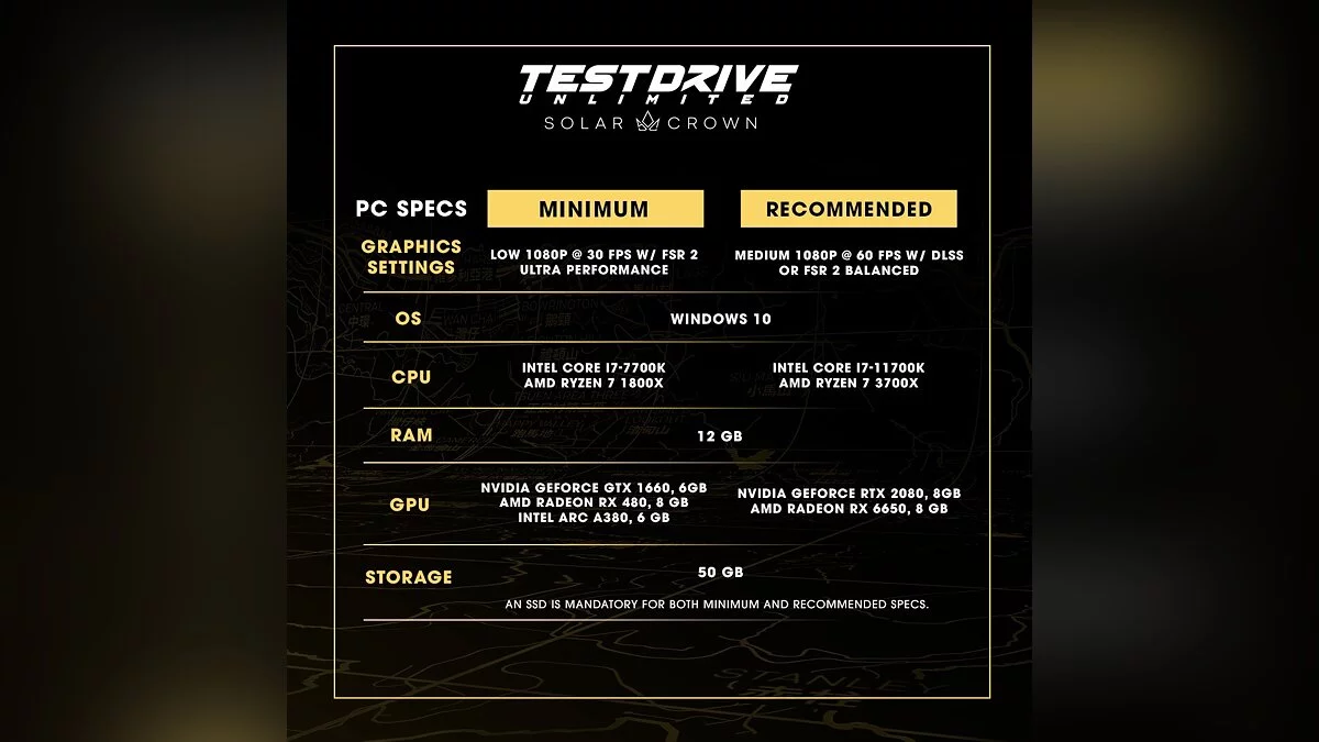 Студия KT Racing опубликовала официальные системные требования предстоящей гонки с открытым миром Test Drive Unlimited Solar Crown. Для запуска игры в 1080p потребуются как минимум Windows 10, NVIDIA GeForce GTX 1660, Intel Core i7-7700K и 12 ГБ оперативной памяти.
