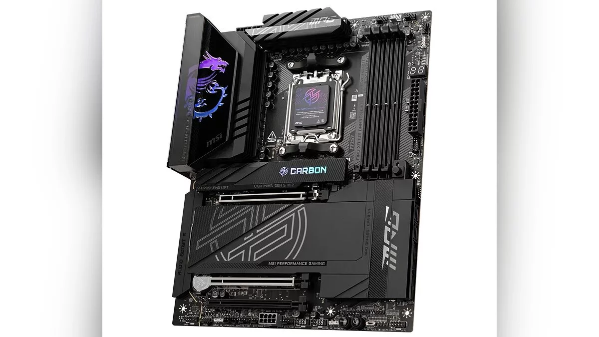 MPG X870E Carbon WIFI предлагает схожий функционал, но с упрощённой схемой питания и меньшим числом интерфейсов. Модель получила 21-фазную систему питания и поддержку PCIe 5.0 для максимальной производительности.
