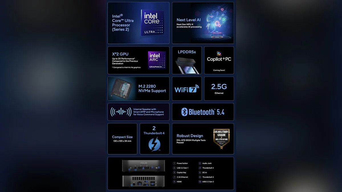 Asus анонсировала новый мини-ПК NUC 14 Pro AI, расширив свою линейку компактных компьютеров. Модель оснащена новыми процессорами Intel Lunar Lake, которые обеспечивают высокий уровень производительности в задачах, связанных с искусственным интеллектом. Процессоры Intel Lunar Lake в NUC 14 Pro AI интегрированы с оперативной памятью, что позволяет сэкономить место внутри устройства, хотя и исключает возможность дальнейшего обновления памяти. Core Ultra 200V, обеспечивает впечатляющую вычислительную мощность, сравнимую с высокопроизводительными настольными системами, однако отсутствие дискретной графики делает мини-ПК мало пригодным для игр, как например, NUC 14 Performance, у которого присутствует графика RTX 4070.