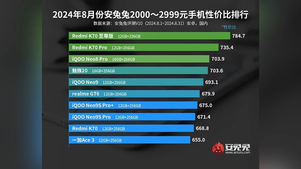 В топе оказались сразу четыре смартфона iQOO, три устройств Redmi, а также по одной модели Meizu, realme и OnePlus. Лидером оказался Redmi K70 Ultra с процессором Dimensity 9300+ и 12 Гб ОЗУ.